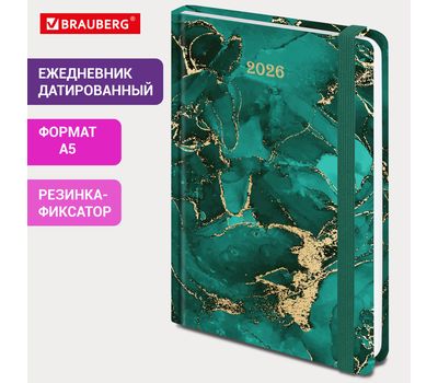 Ежедневник датированный на 2026 год BRAUBERG твердый переплет с резинкой, А5 160 листов, мрамор (145x203 мм)