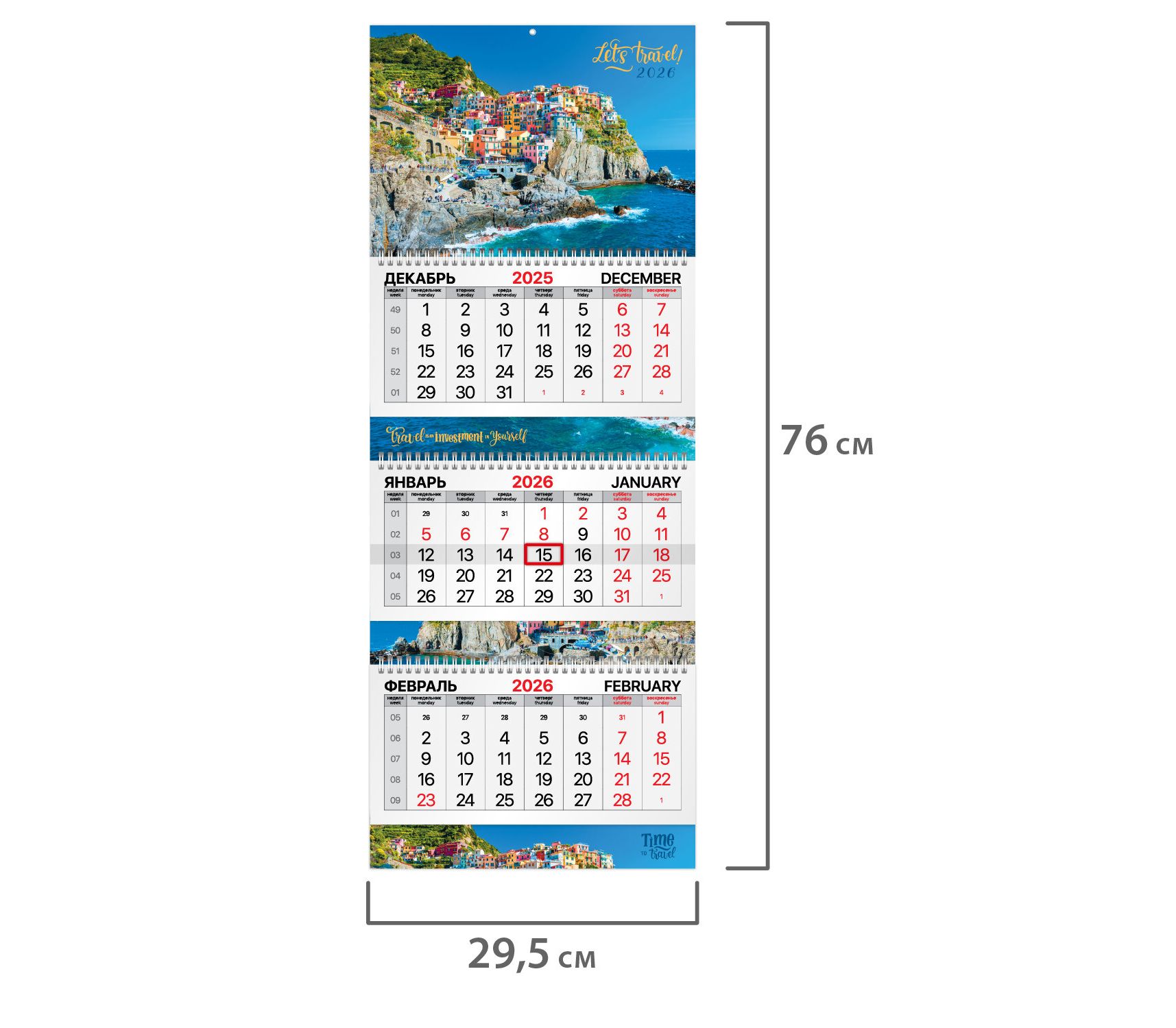 Блок календаря напечатан на мелованной бумаге плотностью 80 г/м2. Подложка изготовлена из мелованного картона плотностью 250 г/м2. Вертикальное расположение. Размер – 29,5х76 см.