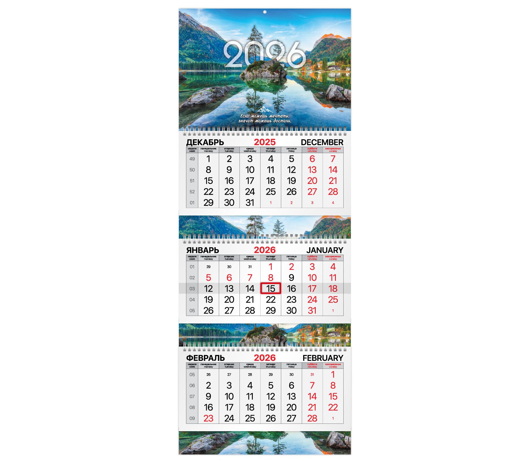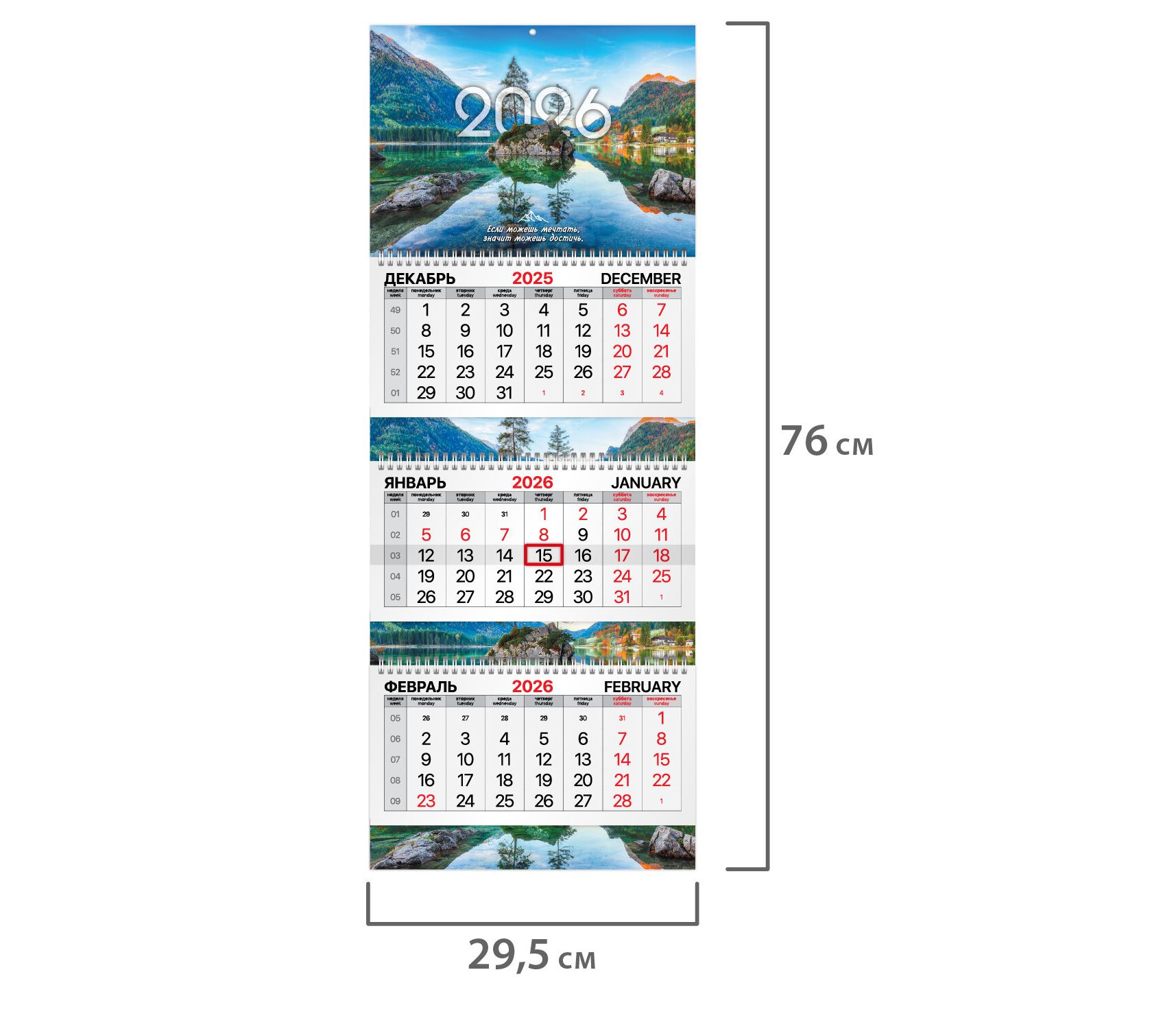 Календарь настенный 3-х блочный на 2026 год BRAUBERG EXTRA "Горное озеро" (29,5х76 см) Премиум