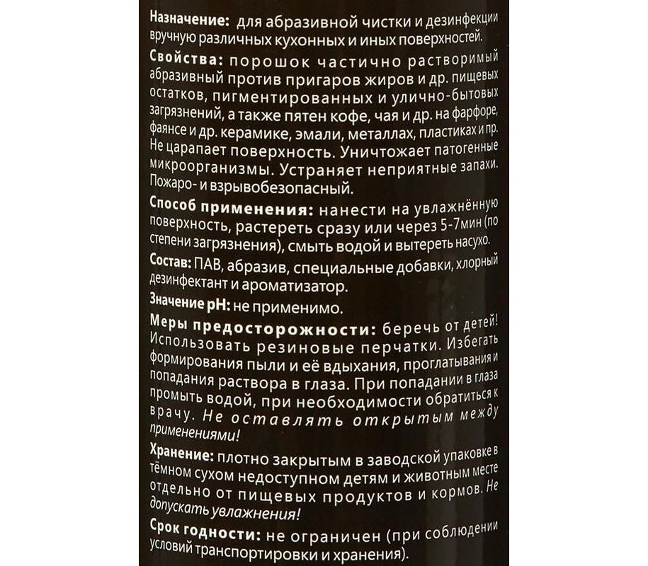 Порошок частично растворимый абразивный против пригаров жиров и других пищевых остатков, пигментированных, улично-бытовых и других загрязнений, в том числе пятен кофе, чая и других на фарфоре, фаянсе и другой керамике, эмали, металлах, пластиках. Не царапает поверхность. Уничтожает патогенные микроорганизмы. Устраняет неприятные запахи. Пожаро- и взрывобезопасный.