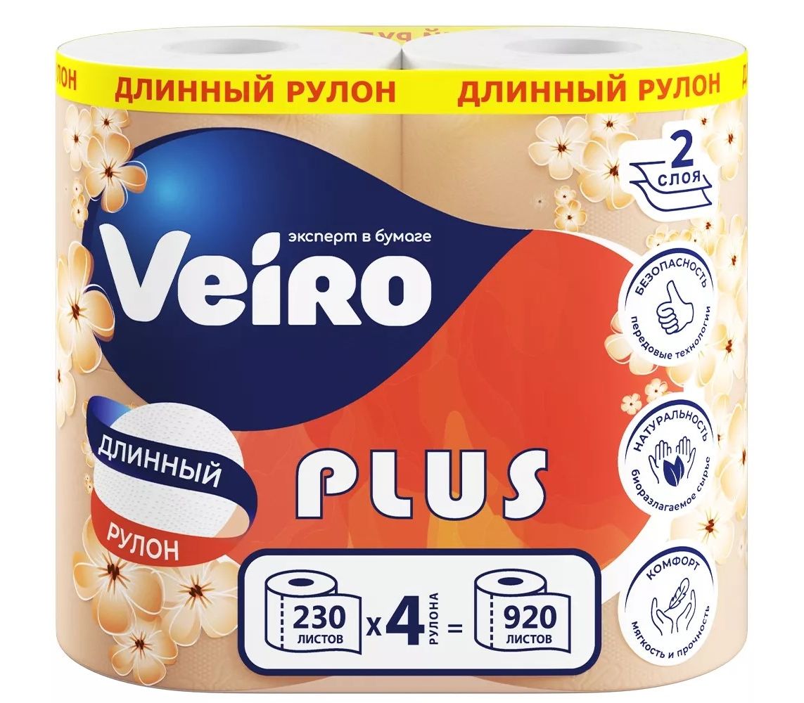 Двухслойная туалетная бумага Veiro белого цвета имеет тиснение. Длина намотки в рулоне — 30 метров, бумажное полотно разделено перфорацией на 240 листов. Упаковка содержит четыре рулона. Туалетная бумага отличается мягкостью, изготовлена из вторичного сырья.
