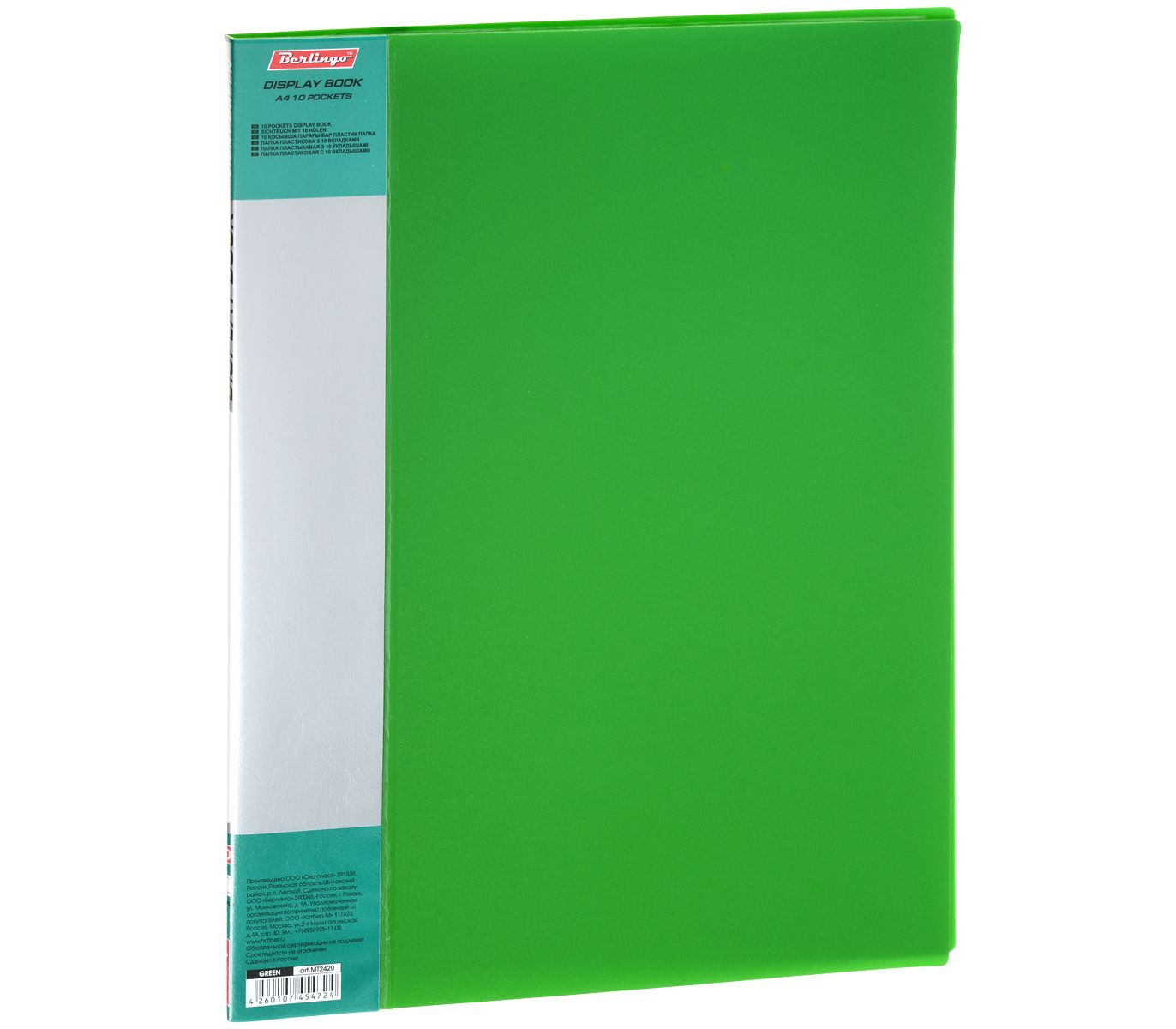 Папка с 10 вкладышами Berlingo "Standard" предназначена для хранения бумаг формата А4. Цвет папки – зелёный. Папка изготовлена из качественного полипропилена плотностью 600 мкм с текстурой «песок». Тип скрепления – термосварка. Размер изделия составляет 235*350 мм. Ширина корешка – 9 мм. Бумагам, вложенным в папку, не требуется перфорация дыроколом. Папка упакована в индивидуальный пакет.
