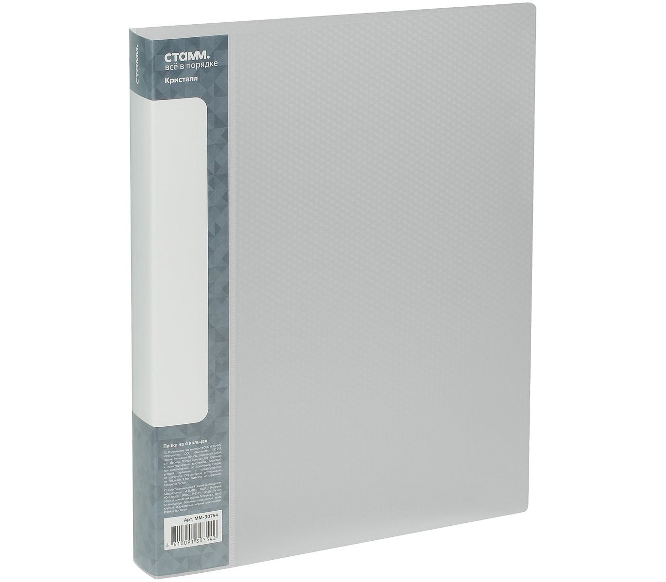 Папка на четырёх кольцах «СТАММ» серии «Кристалл» предназначена для сшивания и хранения документов формата А4. Изделие выполнено из полупрозрачного бесцветного пластика. Внешняя сторона папки дополнена фактурным паттерном «Кристалл», который защищает изделие от загрязнений и повреждений. Папка изготовлена из качественного полипропилена толщиной 700 мкм. Размер папки — 310*250 мм. Кольцевой механизм, состоящий из четырёх колец диаметром 25 мм, надёжно держит документы. Ширина корешка — 40 мм, что позволяет вмещать до 250 листов. Папка подходит для хранения как перфорированных документов, так и папок-вкладышей с универсальной перфорацией. На корешке находится карман. Папка упакована в индивидуальный пакет.