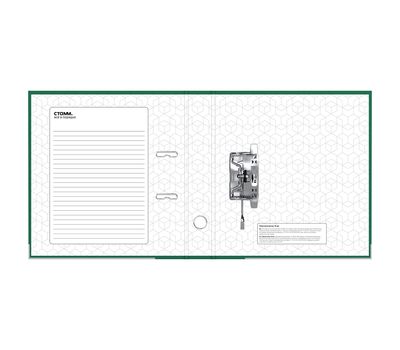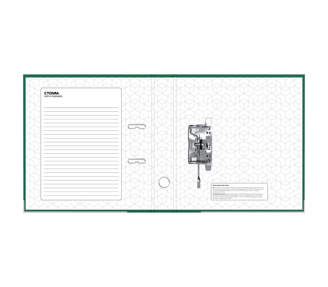 Папка-регистратор «СТАММ» серии «Бизнес» формата А4 с арочным механизмом эффективно экономит офисное пространство и идеальна для создания архива. Папка вмещает до 450 листов. Размер папки – 320*290*50 мм. Ориентация – вертикальная. Ширина корешка составляет 50 мм. Минималистичный классический дизайн: папка выполнена в глубоком зеленом цвете. Изготовлена из жесткого износостойкого картона с односторонним покрытием из бумвинила. Нижние грани укреплены металлическим кантом. Внутреннее покрытие – бумага. Папка имеет арочный механизм из качественного металла. Конструкция разработана с учетом всех особенностей эксплуатации. Эргономичное отверстие в корешке помогает быстро снять папку с полки. На корешке папки есть карман со сменным информационным ярлыком для маркировки. На внутренней стороне обложки папка-регистратор имеет поле для записи.