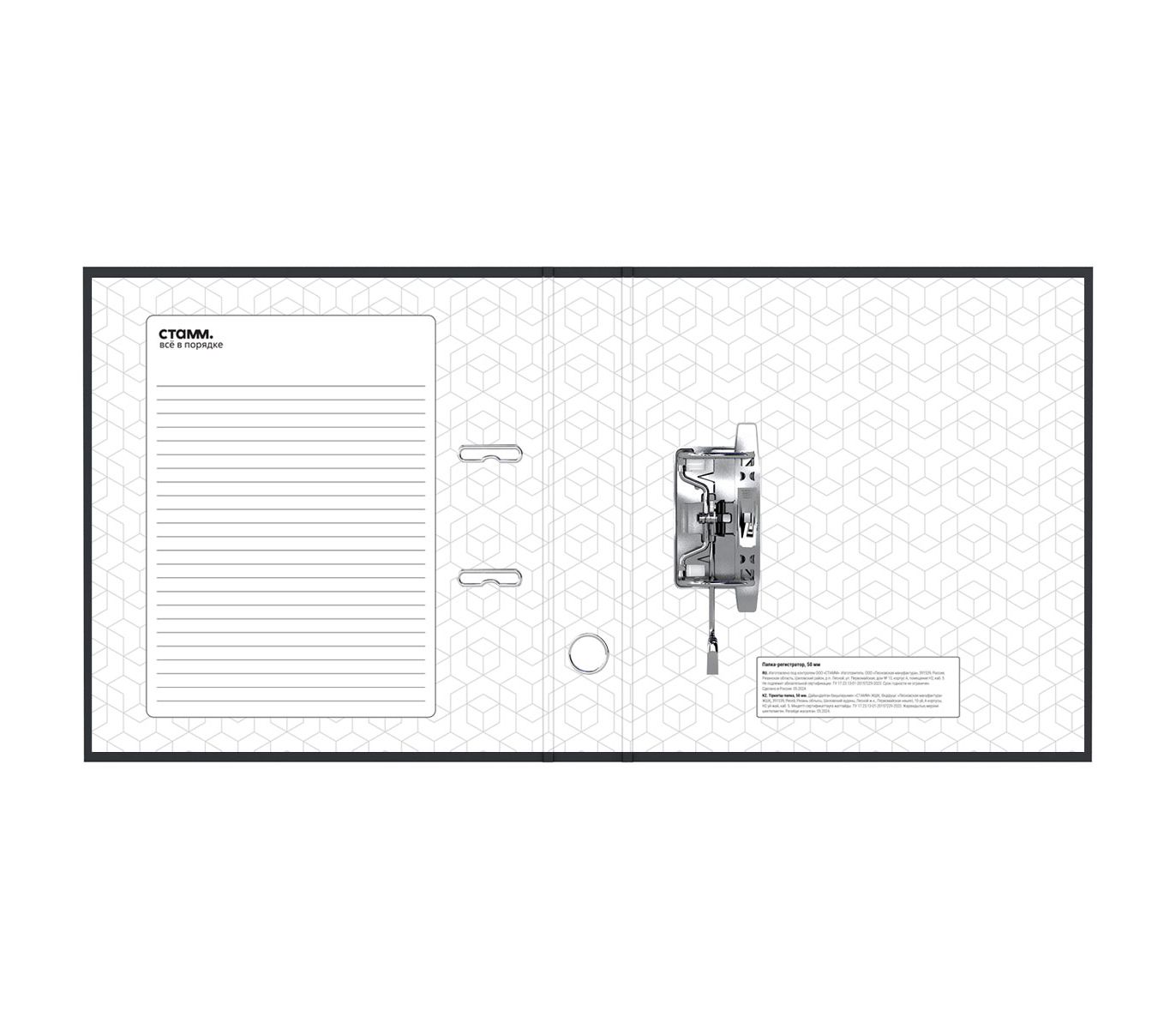 Папка-регистратор «СТАММ» серии «Офис» формата А4 с арочным механизмом идеальна для создания архива и экономии офисного пространства. Размер папки – 320*290*50 мм. Папка вмещает до 450 листов. Ширина корешка составляет 50 мм. Минималистичный классический дизайн: папка выполнена в насыщенном чёрном цвете. Изготовлена из жесткого износостойкого картона с односторонним покрытием из бумвинила. Внутреннее покрытие выполнено из бумаги. Папка имеет арочный механизм из качественного металла. Конструкция разработана с учетом всех особенностей эксплуатации. Эргономичное отверстие в корешке помогает быстро снять папку с полки. На корешке папки есть ярлык для маркировки. На внутренней стороне обложки папка-регистратор имеет поле для записи.