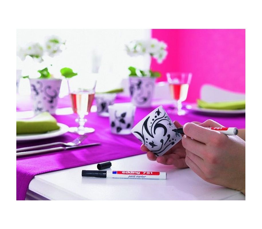 Промышленный лаковый маркер Edding E-751/49, цвет чернил — белый, предназначен для работы на любых материалах: стекло, пластик, дерево или металл. Эргономичный корпус изготовлен из алюминия. Круглый наконечник позволяет проводить линии толщиной от 1 до 2 мм. Быстросохнущие чернила белого цвета с лакирующим эффектом устойчивы к воздействию влаги. Температурный режим краски маркера 1000 ° C. Максимальная температура поверхности при написании маркером не более 100 градусов по Цельсию. Маркер не содержит ксилола, практически не имеет запаха Инструкция по применению маркера: 1. Перед использованием хорошенько встряхнуть с закрытым колпачком. 2. Снимите колпачок, прижмите наконечник к поверхности, надавите и удерживайте пока не проступит краска. 3. Применять после того как убедитесь, что вытекает исходный цвет. Предостережения: плотно закрывайте колпачок после применения, держать маркер вдали от огня, прямые солнечные лучи вызывают обесцвечивание.