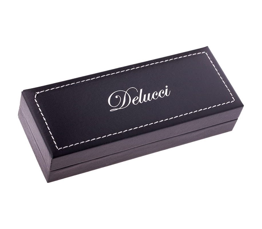 Безупречные формы, великолепный дизайн, качественное исполнение подарочной ручки Delucci никого не оставит равнодушным! Цвет корпуса - темно-серый. Отделка золотистого цвета. Кристаллы на клипе. Орнамент в зоне грипа. Изящная гравировка. Диаметр пишущего узла - 1,0 мм.