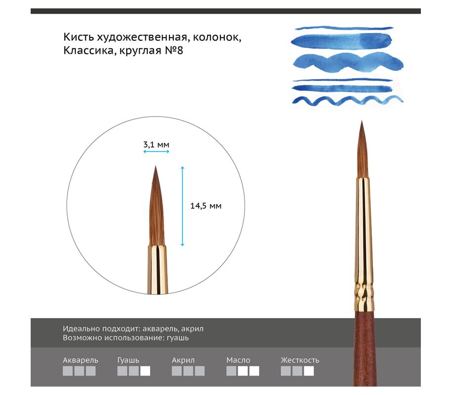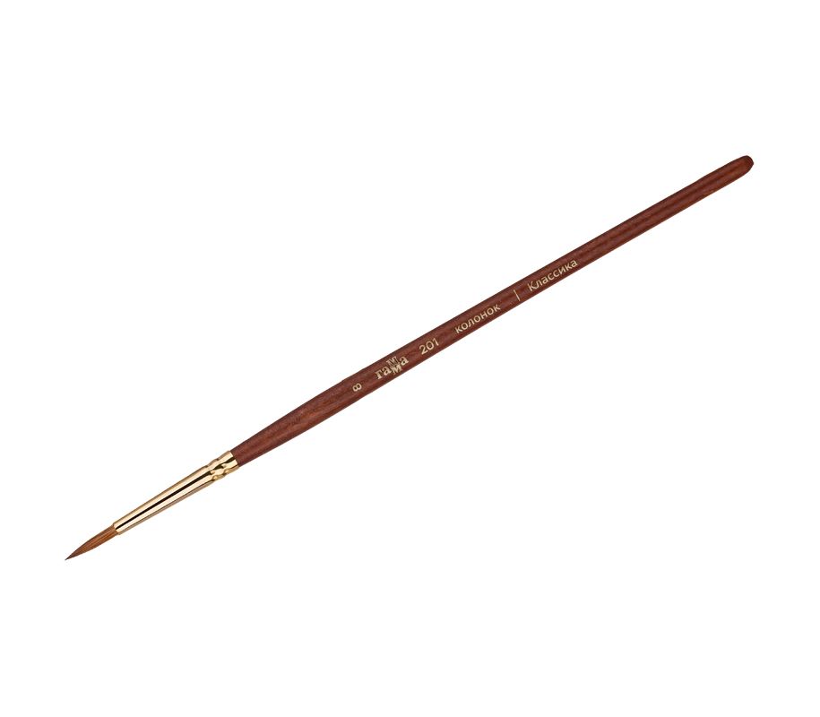 Художественные кисти ГАММА изготовлены из натурального ворса колонка. Изделие предназначено для работы с акварельными, гуашевыми и акриловыми красками. В масляной живописи колонок используют для нанесения гладких, ровных и точных мазков. Волос колонка обладает уникальными свойствами – он одновременно длинный, упругий, эластичный и прочный. Благодаря большей, чем у белки, упругости, кисть позволяет лучше контролировать мазок. Пучок вяжут из волосков разной длины, что позволяет при соприкосновении наполненной кисти с поверхностью создать капиллярный поток краски. Важно проводить своевременный и правильный уход: необходимо очищать кисти от краски до того как они засохнут, это увеличит срок их службы. Ручка из древесины березы покрыта матовым лаком. Кисть имеет никелированную бесшовную обойму и цветную лакированную ручку.