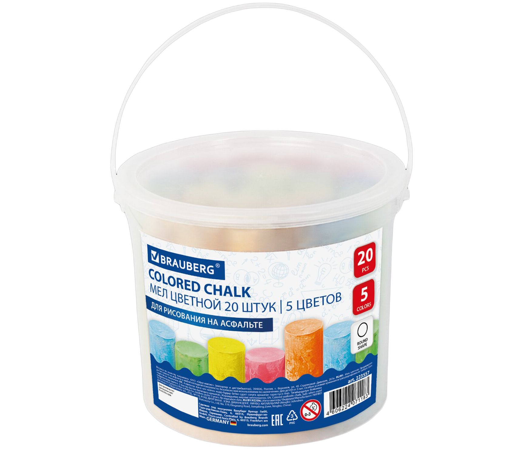 Изготовлен из высококачественного природного сырья, нетоксичен. Благодаря круглой утолщенной форме удобно ложится в руку. Легко смывается водой. Длина - 100 мм, диаметр - 25 мм. В наборе 20 цветных мелков (красный - 4 шт., оранжевый - 4 шт., желтый - 4 шт., зеленый - 4 шт., голубой - 4 шт.). Набор упакован в пластиковое ведро с ручкой.
