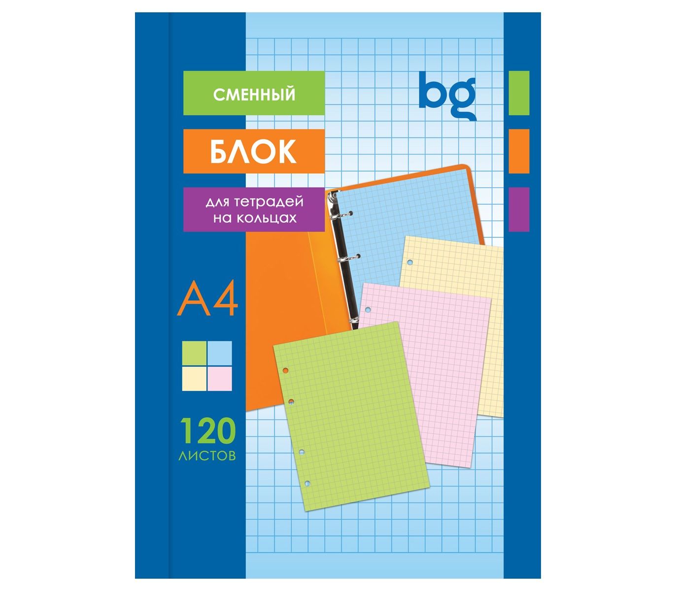 Сменный блок для тетрадей BG формата А4 (204*295 мм) идеально подойдет для работы или учёбы. Количество листов – 120 штук. Листы офсетной бумаги плотностью 60 г/м2 в клетку без полей упакованы в термоусадочную плёнку с полноцветной картонной этикеткой. В наборе ассорти четырёх цветов, по 30 листов каждого.