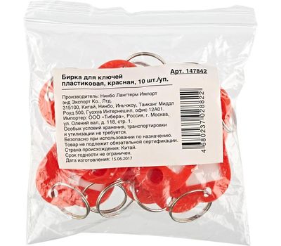 Бирки для ключей изготовлены из пластика красного цвета. Поставляются комплектом по 10 бирок в упаковке. Каждая бирка для ключей снабжена металлическим кольцом. Внутри окошка размером 2,6×1,6 см есть белый бумажный вкладыш, защищенный слоем пластика от повреждения и намокания. На вкладыш можно нанести надпись.