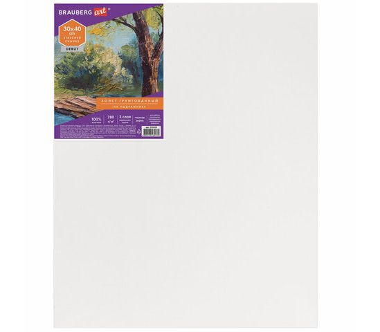 Холст на подрамнике BRAUBERG ART DEBUT, 30×40см, грунтованный, 100% хлопок, мелкое зерно