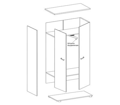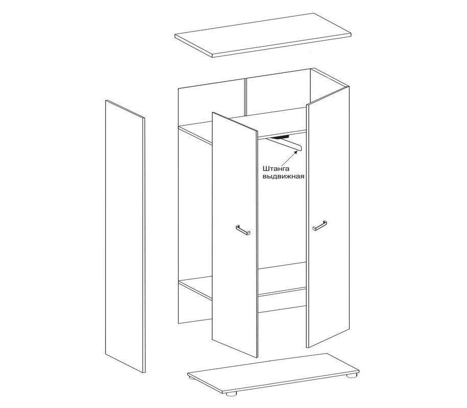 Топ, фасады, корпус шкафа и полки выполнены из ЛДСтП цвета ’’Ясень Шимо’’ в тиснении шагрень. Толщина материала топа шкафа — 22 мм, корпус, полки и фасады — 18 мм. Задняя стенка шкафа выполнена из окрашенного ДВП цвета ’’Беж’’ толщиной 3 мм. Шкаф имеет внутреннее отделение со стационарной полкой для головных уборов и поперечной штангой, закрытое двумя распашными фасадами высотой 1858 мм, установленными на регулируемые петли. Метод крепления петель к корпусу гардероба — евровинты. Стационарная полка установлена на скрытые полкодержатели. Топ гардероба отторцован противоударной кромкой ПВХ цвета ’’Ясень Шимо’’ толщиной не менее 2 мм, остальные детали отторцованы кромкой ПВХ цвета ’’Ясень Шимо’’ толщиной не менее 0,5 мм. Не допускается оставлять незакромленными открытые участки изделий даже на скрытых поверхностях, исключение только для соприкасающихся элементов. Используется только механический способ кромкооблицовки и подрезки. Категорически не допускаются ручная обработка кромочного материала, наличие следов клея, зазоры, выступы, сколы, потертости, заусенцы и прочие повреждения кромки. Для соединения деталей используются направляющие деревянные шканты (бук) и двухкомпонентная эксцентриковая стяжка d15 мм. Метод крепления задней стенки ДВП — в паз с применением пластикового профиля для надежного соединения составных частей. В крепежных элементах отсутствуют ’’одноразовые’’ винты типа ’’шуруп’’ или ’’конфирмант’’, а также ’’скобы’’ для крепления ДВП. для нивелирования неровностей пола на днище шкафа установлены четыре регулируемых по высоте опоры с ходом регулировки 15 мм. Диаметр опор — 50 мм, высота — 27 мм, цвет — черный. Регулировка высоты осуществляется через технологические отверстия, расположенные внутри шкафа.