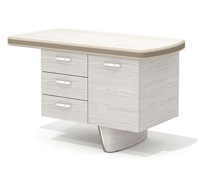 Боковая приставка стола New. Tone Nt-12R правосторонняя. Правая боковая приставка для стола Nt-210 выполнена из плиты МДФ, облицованной файн-лайн шпоном цвета дуб серебристый. Столешница имеет визуальную толщину 64 мм со скругленными торцами, покрытыми эмалью бежевого цвета (Ral 1019). Торцы столешницы дополнительно декорированы вставками из экокожи цвета стоун. Опора приставки выполнена в виде объемного короба треугольной формы с наклонной съемной панелью, обтянутой экокожей в тон вставок столешницы. Опора декорирована металлическим молдингом с покрытием хром глянцевый. В съемной панели используется магнитный крепеж. Тумба приставки оснащена отделением, закрытым распашным фасадом и секцией с тремя выдвижными ящиками, установленными на скрытые шариковые направляющие полного выдвижения. Дверь и ящики оснащены механизмами плавного закрывания. Лицевая фурнитура из металла с покрытием хром глянцевый. Внутреннее наполнение тумбы и корпуса выдвижных ящиков выполнены из ЛДСП цвета мокко. Днища ящиков обтянуты экокожей цвета стоун. Для нивелирования неровностей пола предусмотрены регулируемые по высоте опоры.