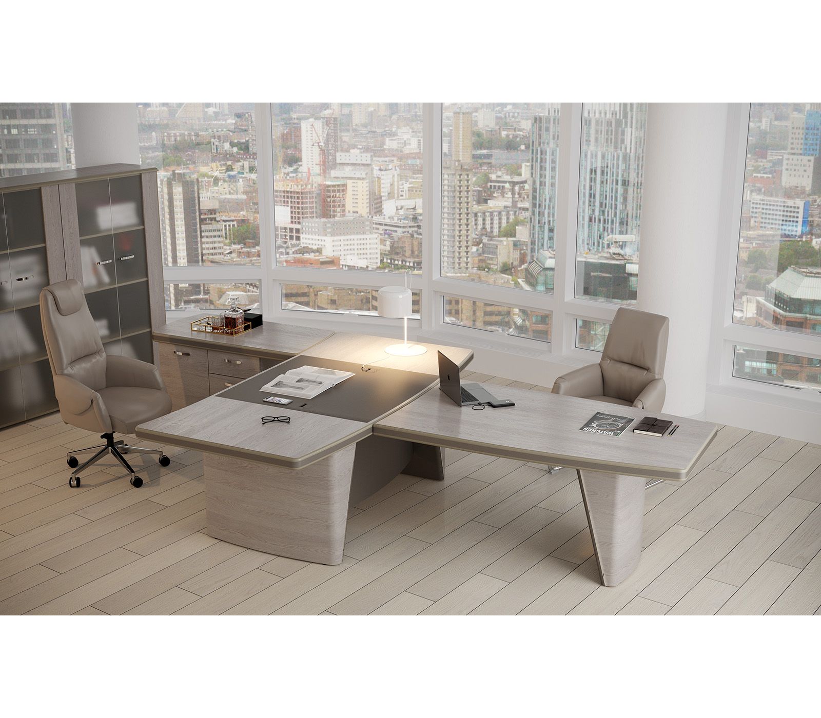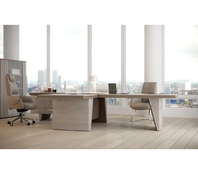 Топ, фасады, боковые и задняя стенки тумбы выполнены из плиты МДФ и облицованы шпоном цвета «Дуб серебристый» с четырехслойным покрытием износостойким лаком, нанесенным по технологии «открытые поры». Боковые и задние стенки выдвижных ящиков, основание и перегородки тумбы выполнены из древесно-стружечной плиты, облицованной пленкой цвета «мокк» на основе термореактивных полимеров (ГОСТ 32289-2013) в тиснении «шагрень». Топ тумбы имеет толщину 25 мм, остальные детали– 16 мм. Торцы топа тумбы – скругленные, с эмалевым покрытием бежевого цвета. Днища выдвижных ящиков – ХДФ толщиной 3 мм, обтянутое экокожей цвета Стоун. Тумба имеет два вместительных отделения, закрытые распашными фасадами высотой 486 мм, и серединную секцию с тремя выдвижными ящиками. Распашные фасады установлены на регулируемые петли, выдвижные ящики – на скрытые шариковые направляющие полного выдвижения. Метод крепления петель к корпусу тумбы – евровинты. Все распашные фасады и выдвижные ящики оснащены механизмами плавного закрывания. Лицевая фурнитура – металлическая, тип «скоба», цвет «хром глянцевый», длина не менее 134 мм (межцентровое расстояние 128 мм). Топ тумбы имеет эргономичную форму со скругленными углами и криволинейными боковыми сторонами. Скругление боковых зон топа –плавное (радиусы R40 и R850 мм). Криволинейные переходы топа выполнены исключительно механическим способом на высокоточном оборудовании. Категорически не допускаются ручная обработка материала, наличие неровностей, сколов, царапин и прочих повреждений материала. Глубина топа тумбы – 534 мм, длина – 1320 мм. Ширина боковин тумбы –494 мм. Высота тумбы в сборе – 565 мм. Категорически не допускаются ручная обработка материала, наличие неровностей, сколов, царапин и прочих повреждений материала. Элементы тумбы из ЛДСП отторцованы кромкой на основе поливинилхлоридной смолы в цвет материала толщиной не менее 0,5 мм. Не допускается оставлять незакромленными открытые участки изделий даже на скрытых поверхностях, исключение только для соприкасающихся элементов. Используется только механический способ кромкооблицовки и подрезки. Категорически не допускаются ручная обработка кромочного материала, наличие следов клея, зазоры, выступы, сколы, потертости, заусенцы и прочие повреждения кромки. Для соединения деталей используются вставные шипы круглого сечения с прямыми рифлями и дюбели эксцентриковой стяжки быстрого монтажа с гайками растекс 15 На днище тумбы установлены пять мобильных колесных опор d40 мм черного цвета. Две из пяти опор имеют стопоры. Мебель поставляется в разобранном виде, упакованная в короб (короба) из гофрокартона с наклеенной этикеткой с полной выходной информацией. Углы упаковки с деталями мебели защищены пластиковыми накладками (уголками) из ударопрочного пластика. Изделие снабжено инструкцией по сборке, которая вкладывается в упаковку. Серия мебели имеет актуальную декларацию о соответствии по требованиям технического регламента таможенного союза 025/2012. Мебель соответствует единым санитарно-эпидемиологическим и гигиеническим требованиям, что подтверждается протоколом испытаний.