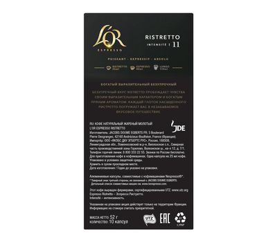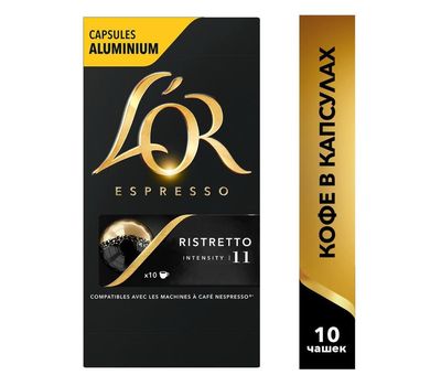 L'OR Espresso Ristretto кофе натуральный жареный молотый в алюминиевых капсулах, 10 шт, 52 г Совместимы с кофемашинами Nespresso. Тщательно продуманный вкус ристретто пробуждает чувства своим выразительным характером и богатым пряным ароматом. Безупречный купаж и каждый глоток насыщенного ристретто погружает вас в незабываемое вкусовое путешествие. Для приготовления кофе в кофемашинах. Одна капсула на 25 мл кофе. Упаковано в защитной среде.